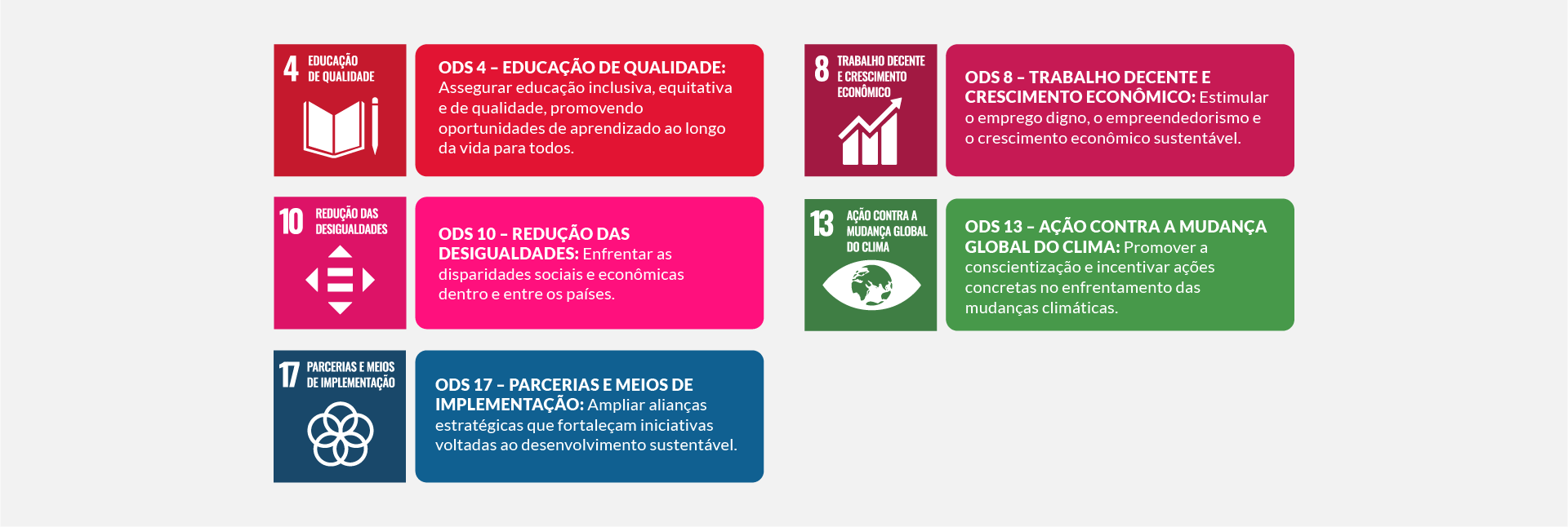 As iniciativas do Complexo são guiadas por cinco Objetivos de Desenvolvimento Sustentável (ODS) prioritários da Agenda 2030 da ONU: